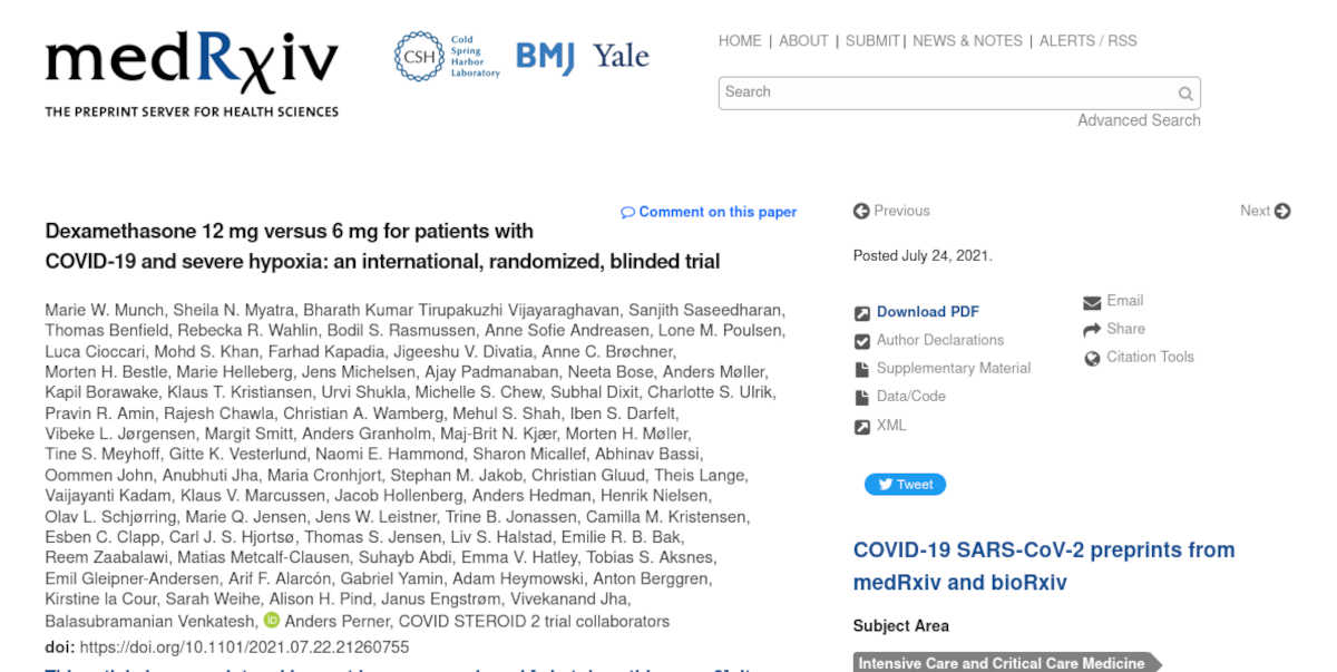 Munch MW, Myatra S, Vijayaraghavan BKT, Saseedharan S, Benfied T, et al. Dexamethasone 12 mg versus 6 mg for patients with COVID-19 and severe hypoxia: an international, randomized, blinded trial. MedRxiv 2021;epublished July 24th